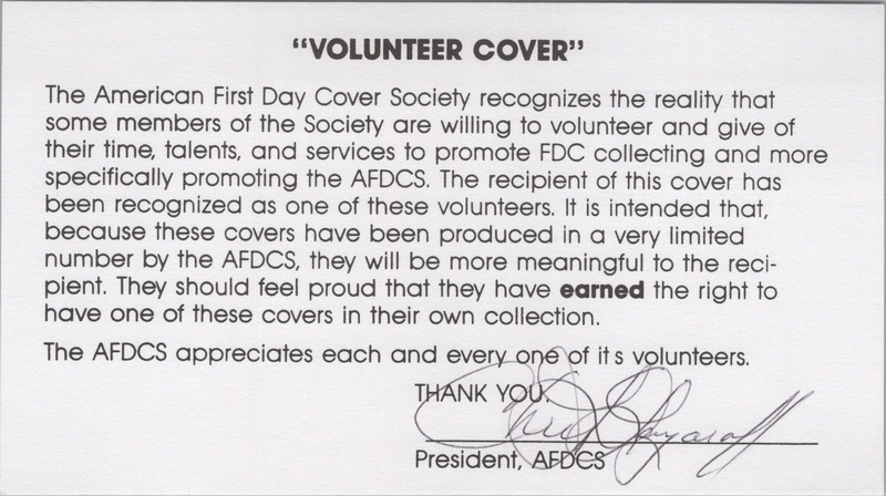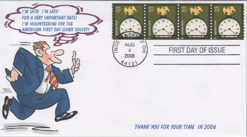 | | AFDCS Volunteer Thank You Covers | | 203 | 3762 | 8/4/2006 | American Design Series, American Clock, coil; Homespun Cachets; 100 made | $15.00 |