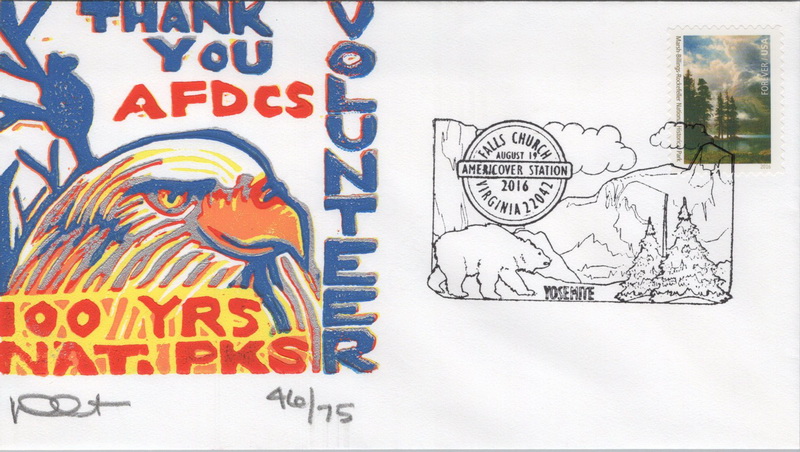 | | AFDCS Volunteer Thank You Covers | | 209 | 5080c | 6/2/2016 | National Parks Service Centennial, Marsh-Billings-Rockefeller; Dave Curtis Cachets; RBP; 75 made | $20.00 |