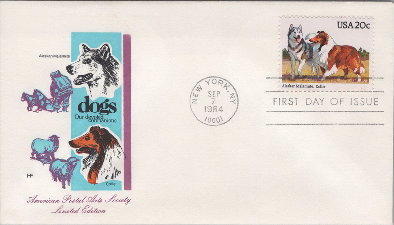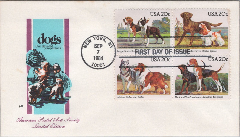 | | American Postal Arts Society | | 259 | 2101a | 9/7/1984 | Dogs, Set of 5; American Postal Arts Society | $25.00 |