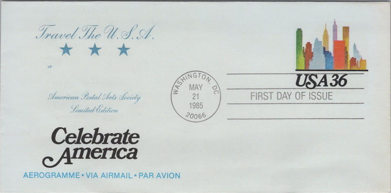 | | American Postal Arts Society | | 262 | UC059 | 5/21/1985 | Urban Skyline, letter sheet; American Postal Arts Society | $8.00 |
