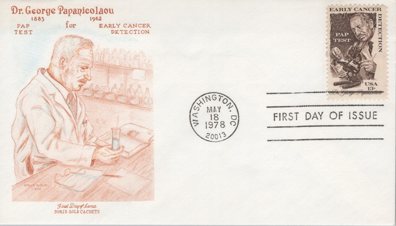 | | Doris Gold Cachets | | 460 | 1754 | 5/18/1978 | Dr. George Papanicolaou, Pap Test; Doris Gold Cachets; Design 1 | $8.00 |