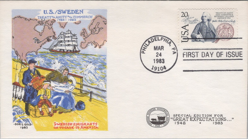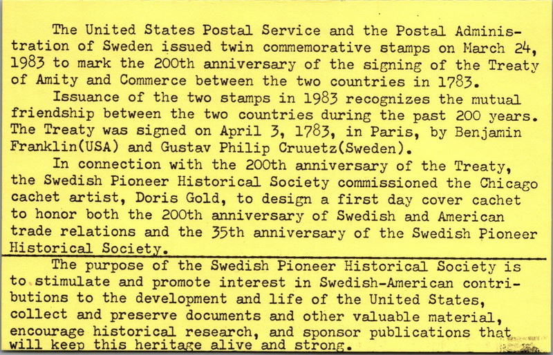 | | Doris Gold Cachets | | 506 | 2036 | 3/24/1983 | U.S. - Sweden; Doris Gold Cachets; With Swedish Pioneer Historical Society imprint lower right | $10.00 |