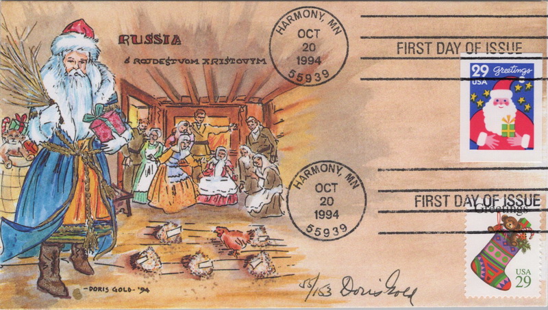 | | Doris Gold Cachets | | 546 | 2873 | 10/20/1994 | Christmas 1994, Santa; Doris Gold Cachets; Dual FDOI #2872; Gold Dot Variety - sold at a show; 153 made | $20.00 |