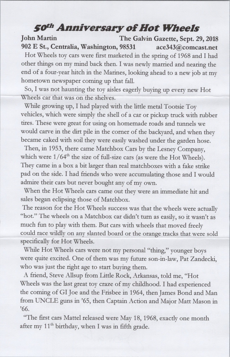 | | John Martin, ACE 343 | | 575 | 5326 | 9/29/2018 | Hot Wheels, Bone Shaker; Martin, John; UO Galvin WA | $10.00 |