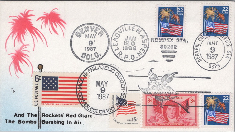 | | TF Cachets | | 626 | 2276 | 5/9/1987 | Flag & Fireworks; TF Cachets; HPD; UO Cancels - Denver CO; 55 made | $20.00 |