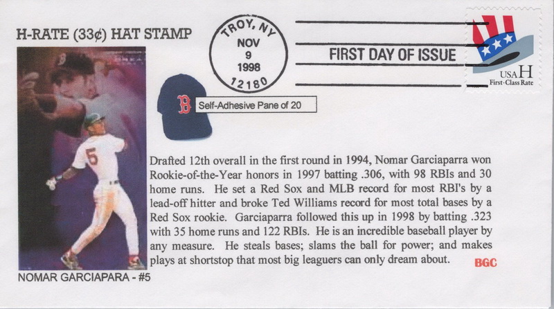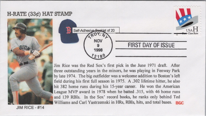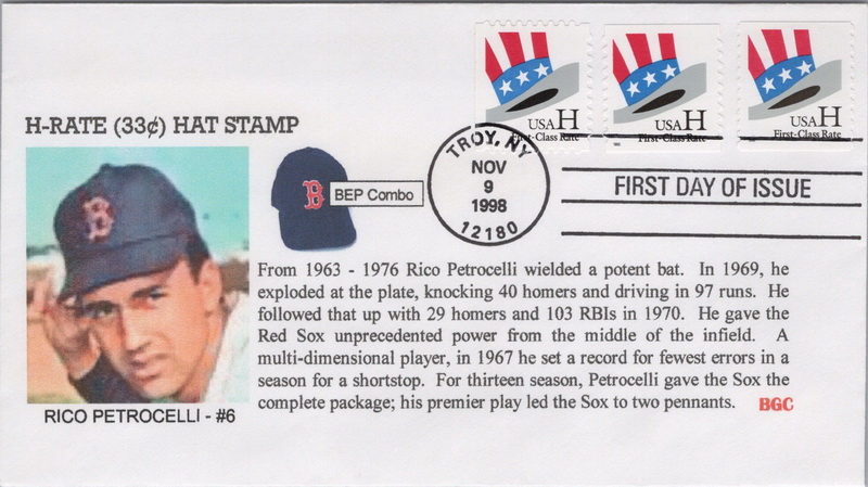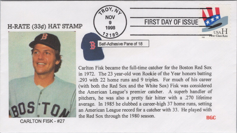 | | Baseball | | 716 | 3264 | 11/9/1998 | "H" Uncle Sam's Hat, coil; Barry & Gerry Covers, Set of 5; Baseball Hats of Rico Petrocelli, Carlton Fisk, Jim Rice, Nomar Garciapara, and Carl Yastrzemski | $30.00 |