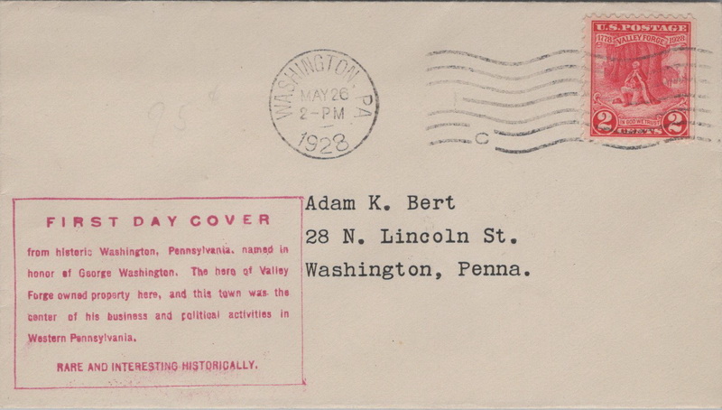 | | First Cachets | | 794 | 0645 | 5/26/1928 | Valley Forge; Bert, Adam K.; P23; RSC; magenta; Washington, PA; PM MC TA to Bert | $90.00 |