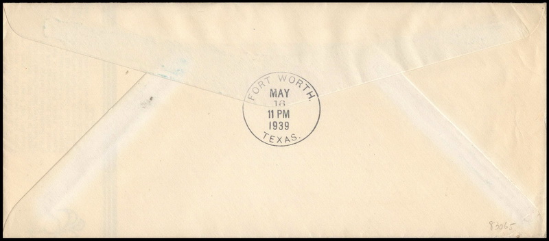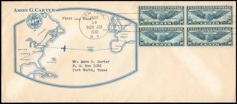 | | First Cachets | | 805 | C024 | 5/16/1939 | Trans-Atlantic (Winged Globe); Carter, Amon G.; P60; blue; Block of 4; HC TA to Carter | $250.00 |