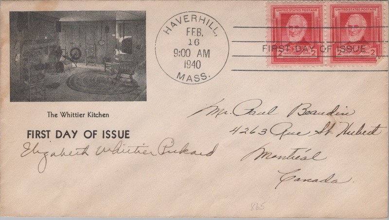 | | First Cachets | | 807 | 0865 | 2/16/1940 | John G. Whittier; Trustees of the John Greenleaf Whittier Birthplace; FA; black; PR HC IA; bold "FIRST DAY OF ISSUE"; Signed by Elizabeth Whittier Packard | $50.00 |