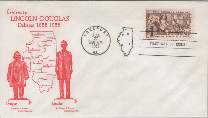 | | First Cachets | | 819 | 1115 | 8/27/1958 | Abraham Lincoln, Lincoln-Douglas Debates; Western Cachet; M27; red-orange | $15.00 |