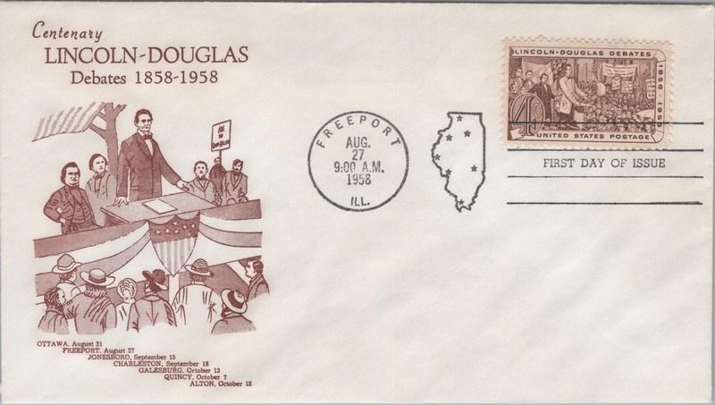 | | First Cachets | | 820 | 1115 | 8/27/1958 | Abraham Lincoln, Lincoln-Douglas Debates; Western Cachet; M25; brown | $15.00 |