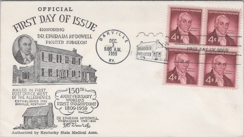 | | First Cachets | | 824 | 1138 | 12/3/1959 | Dr. Ephrain McDowell; Kentucky State Medical Association; M13; black | $15.00 |