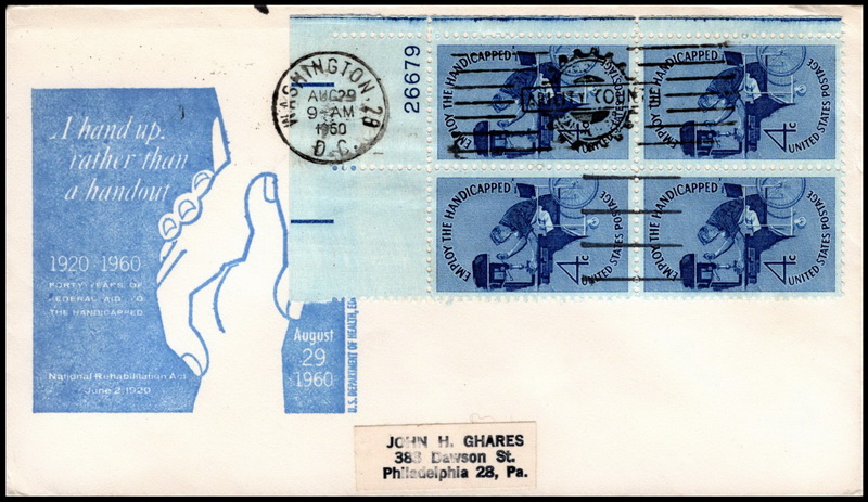 | | First Cachets | | 828 | 1155 | 8/28/1960 | Employ the Handicapped; M24; blue; 2nd Day DC SMC LA; UL PB4 #26679; First Cachet | $16.00 |