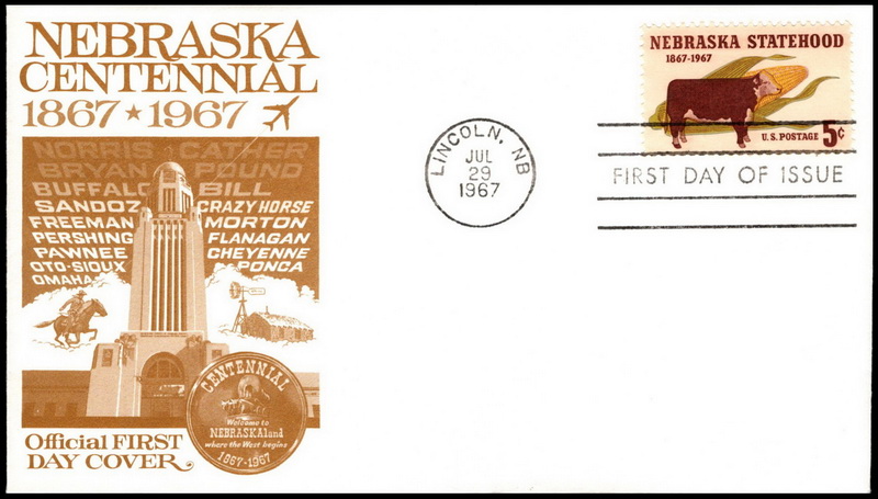 | | First Cachets | | 834 | 1328 | 7/29/1967 | Nebraska Statehood; Nebraska Centennial Commission; M29; brown; with enclosure; First Cachet | $15.00 |