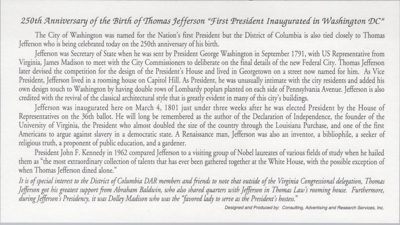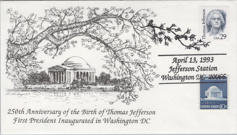 | | First Cachets | | 863 | 2185 | 4/13/1993 | Thomas Jefferson; Consulting Advertising and Research Services, Inc.; with enclosure, PHC | $20.00 |