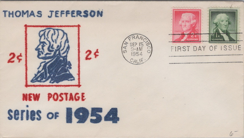 | | Flocked Cachets | | 869 | 1033 | 9/15/1954 | Thomas Jefferson; Velvatone; M53 | $15.00 |