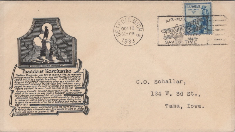| | 1930s | | 980 | 0734 | 10/13/1933 | General Kosckiuszko; Anderson; P8; black; Detroit MI; SMC 530PM TA | $30.00 |