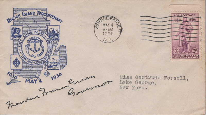 | | 1930s | | 986 | 0777 | 5/4/1936 | Rhode Island, 300 Years; Guertin Art Service; P26; blue; 9AM MC TA; Signed by Governor | $50.00 |
