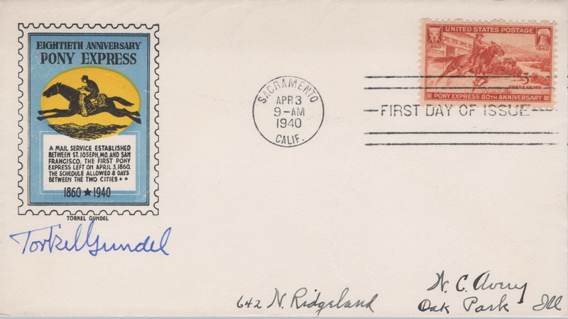 | | 1940s | | 1002 | 0894 | 4/3/1940 | Pony Express, 80 Years; Gundel, James T.; M33; black blue yellow; Sacramento CA; MC IA; Signed by Cachetmaker | $15.00 |