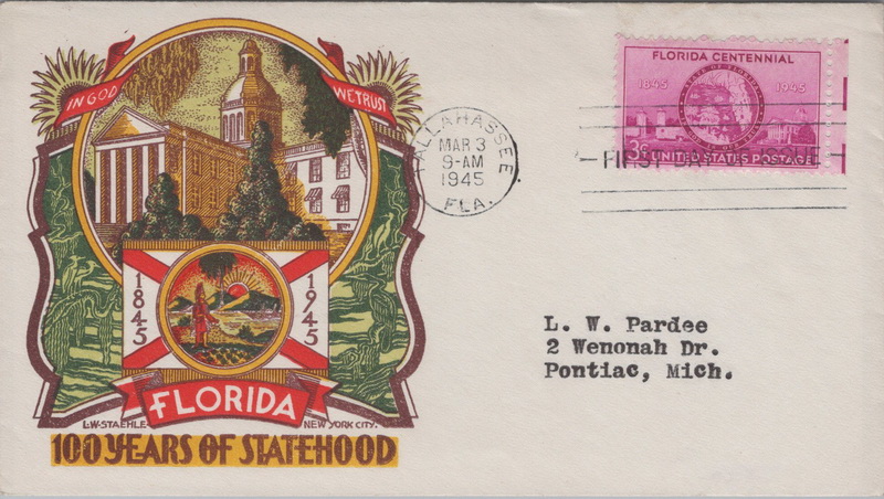 | | 1940s | | 1012 | 0927 | 3/3/1945 | Florida Centennial; Staehle; M20; multicolored; Tallahassee FL; MC TA | $12.00 |