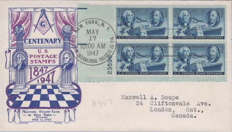 | | 1940s | | 1021 | 0947 | 5/17/1947 | Postage Stamp Centenary; Fleetwood; M61; blue/purple; Art by Dorothy Knapp; LL PB4 23596 SHC TA | $15.00 |