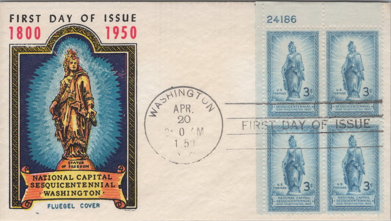 | | 1950s | | 1045 | 0989 | 4/20/1950 | National Capitol, Freedom Statue; Fluegel; M18; multicolored; UL PB4 24186 HC | $12.00 |