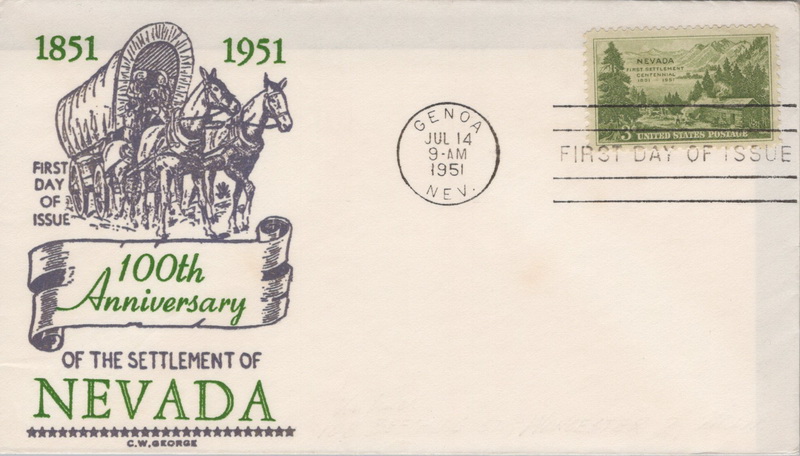 | | 1950s | | 1054 | 0999 | 7/14/1951 | Nevada Centennial; George, Charles W.; M13; green/purple | $12.00 |