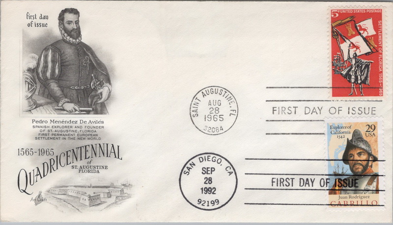 | | 1960s | | 1100 | 1271 | 8/28/1965 | St. Augustine Florida Quadricentennial; Artcraft; M3; Dual FDOI #2704 Cabrillo - Explorer of California | $10.00 |