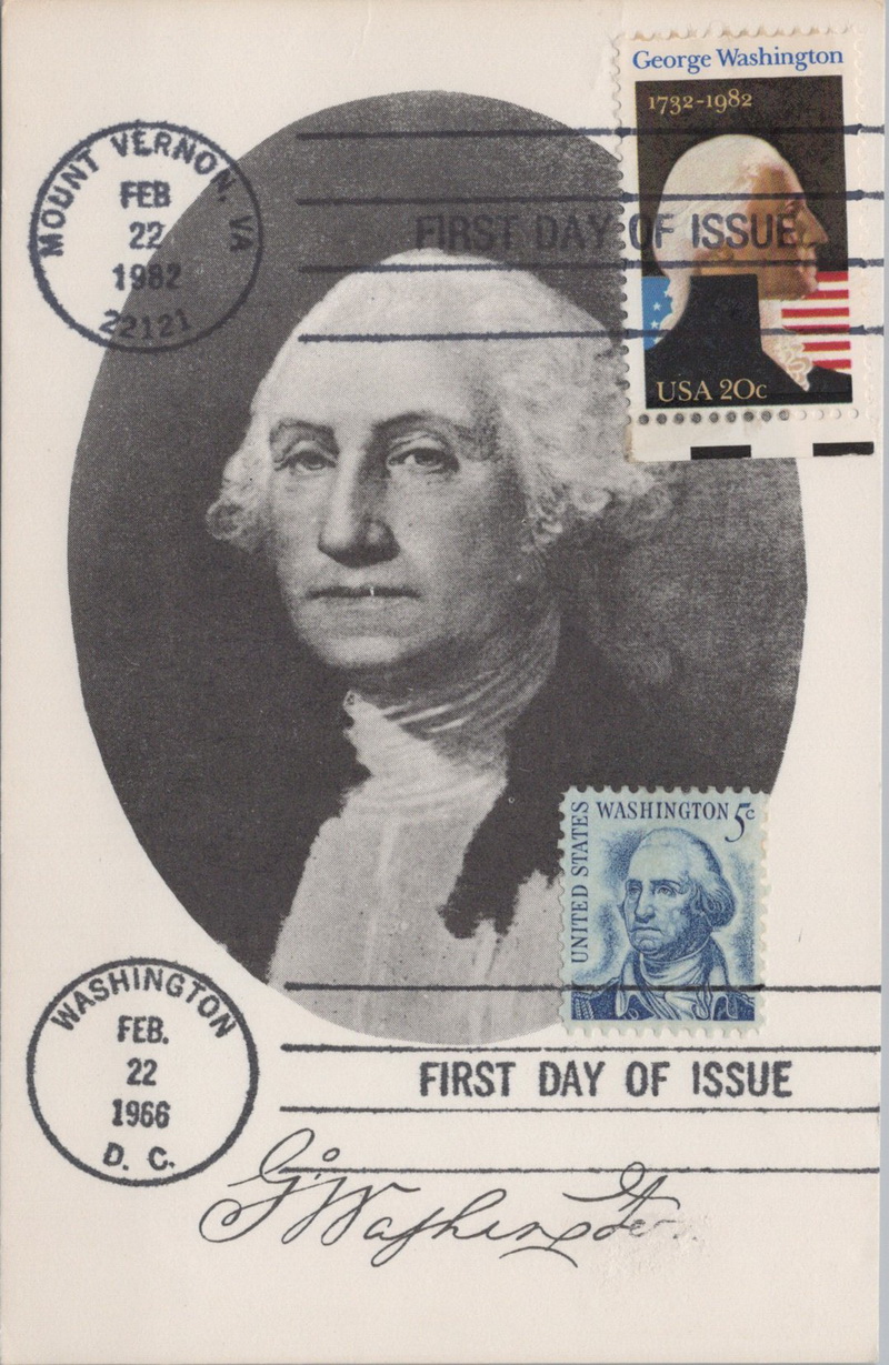 | | 1960s | | 1101 | 1283 | 2/22/1966 | George Washington; UNK; MNLPC; 3.5 x 5.5 card; Dual FDOI #1952 George Washington at top | $12.00 |