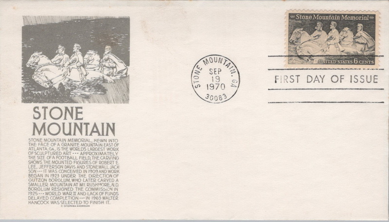 | | 1970s | | 1111 | 1408 | 9/19/1970 | Stone Mountain Memorial; (6) different cachets/post cards | $35.00 |