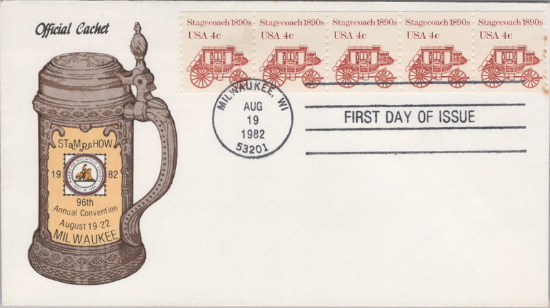 | | 1980s | | 1160 | 1898a | 8/19/1982 | Stagecoach, Coil; UNK; 96th Annual APS Convention & Stamp Show; Strip of 5 | $10.00 |