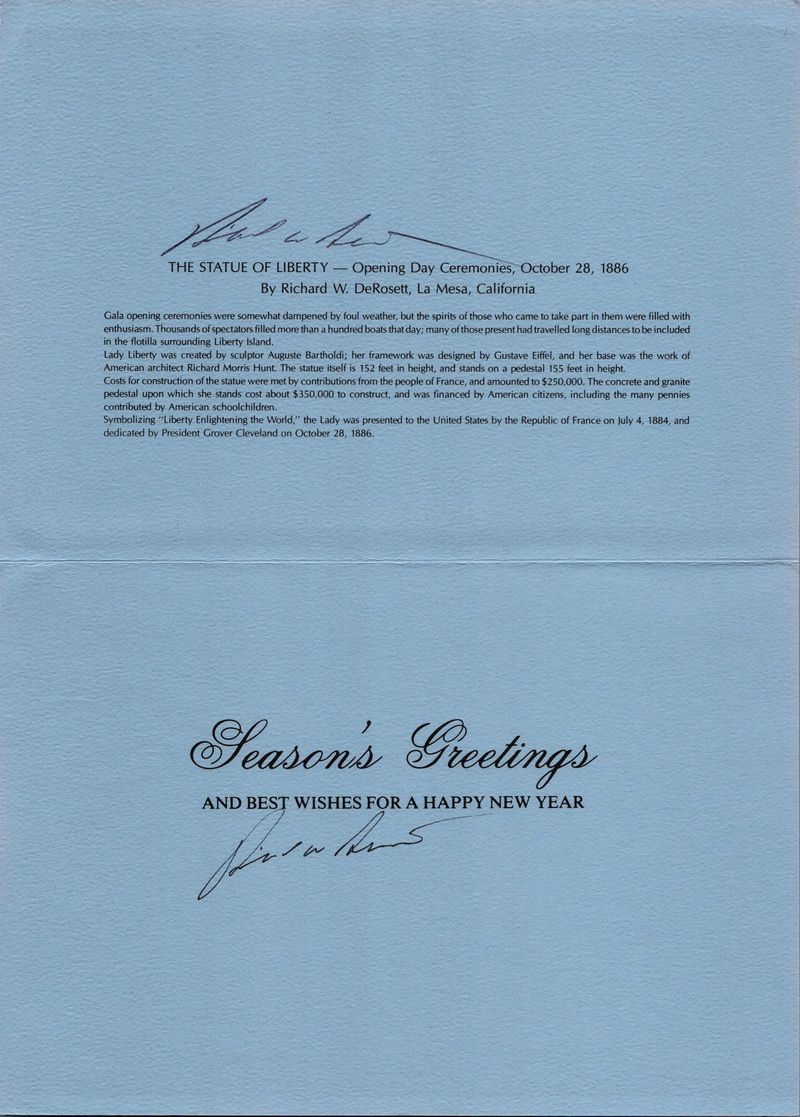 | | 1990s | | 1209 | 2531a | 6/25/1991 | Statue of Liberty Torch; DeRosset Cachets; Greeting Card sent to Subscribers; 25 made | $30.00 |