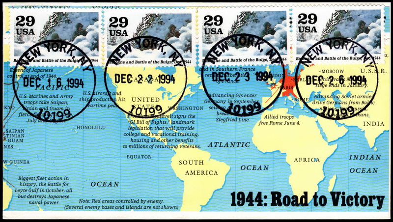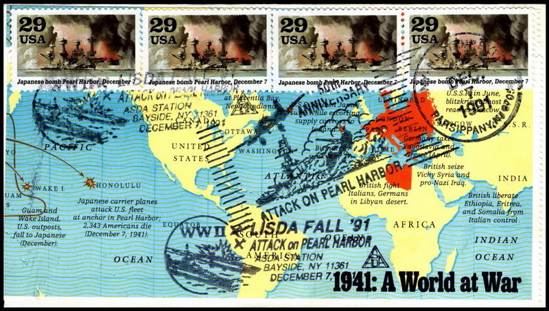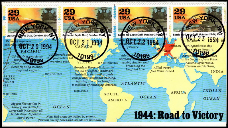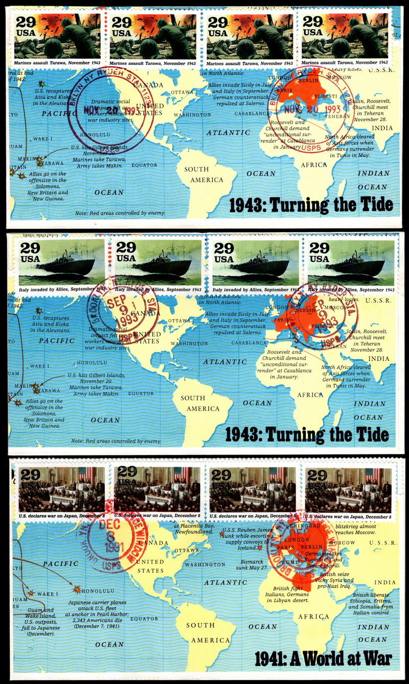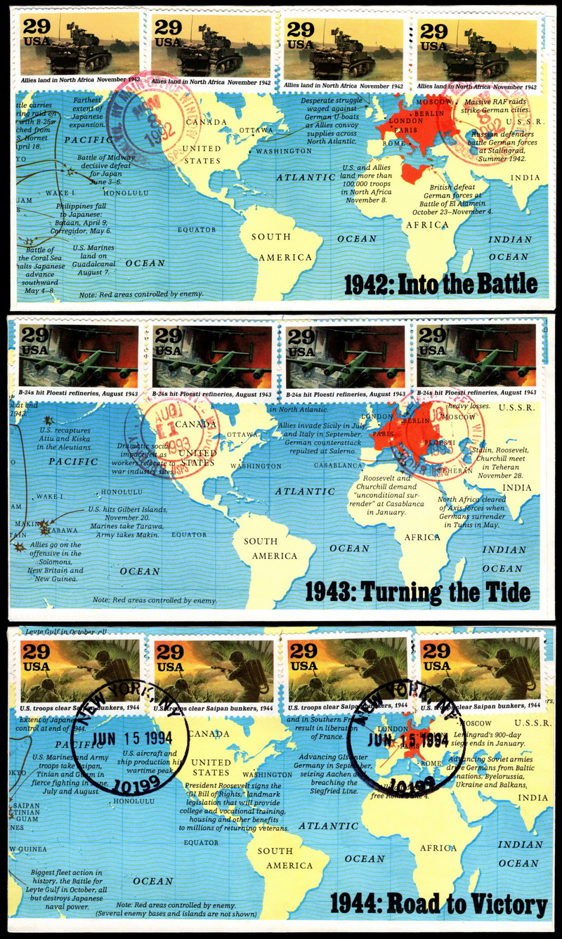 | | Event Covers | | 1298 | Event | | 1991, Group of 9 WWII event cvs, each serviced on 50th anniversary of event w/4 sgls of event from WWII SS, cach is selvage from WWII SS | $30.00 |