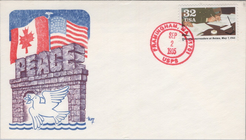 | | Event Covers | | 1309 | Event | 9/2/1995 | Marg; VE-Day 50th Anniversary; Marg cachet for prior Peace Bridge stamp; Framingham MA | $12.00 |