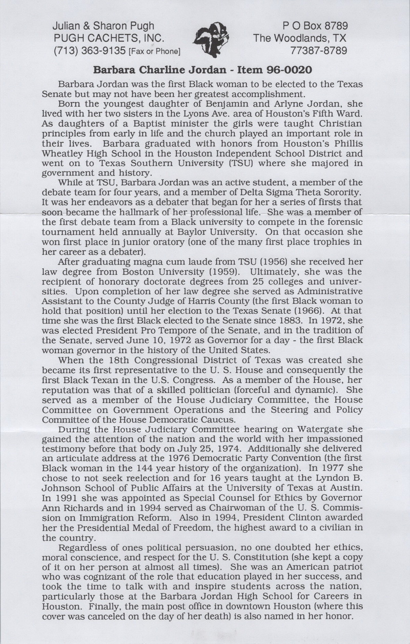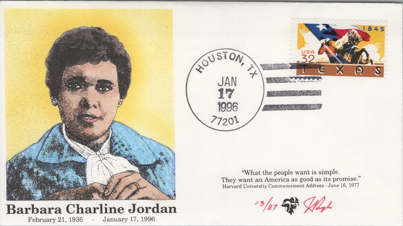 | | Event Covers | | 1311 | Event | 1/17/1996 | Pugh; Mourning Day: Barbara Jordan - First black woman elected to Texas Senate | $15.00 |