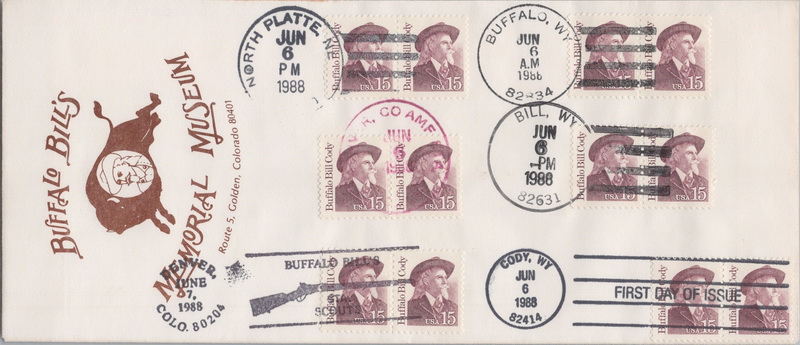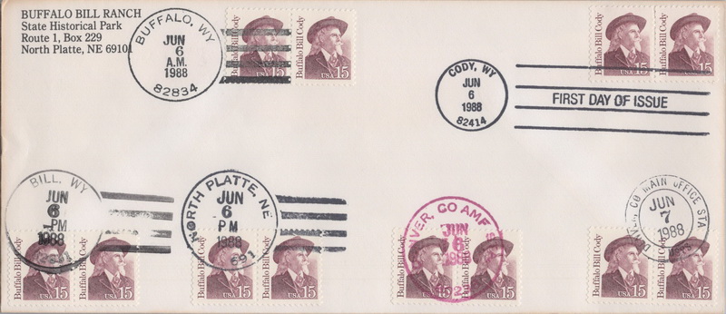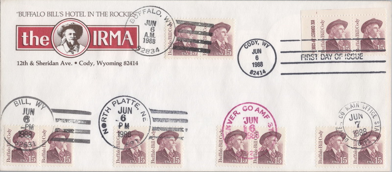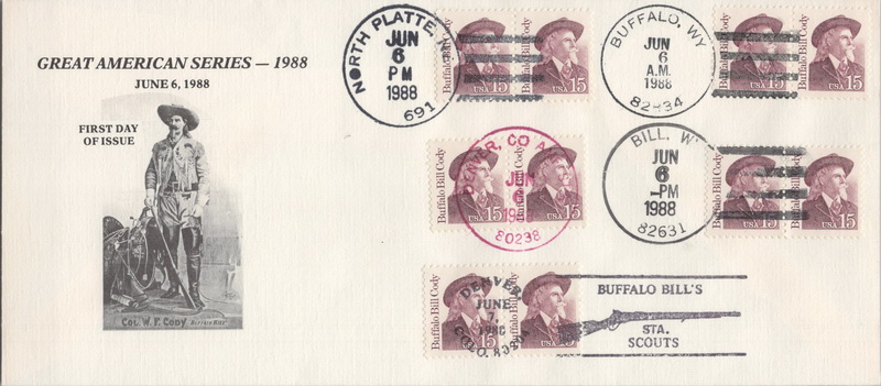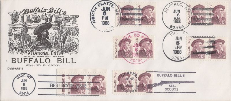 | | Sets & Collections | | 1343 | 2177 | 6/6/1988 | Buffalo Bill Cody; Collection of 9 Size 10 FDCs with multiple FDOI/UO cancels | $80.00 |