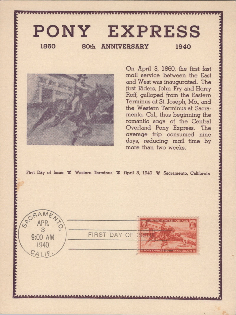| | Oversized Items | | 1357 | 0894 | 4/3/1940 | Pony Express, 80 Years; UNK; MNL; Sacramento CA | $25.00 |