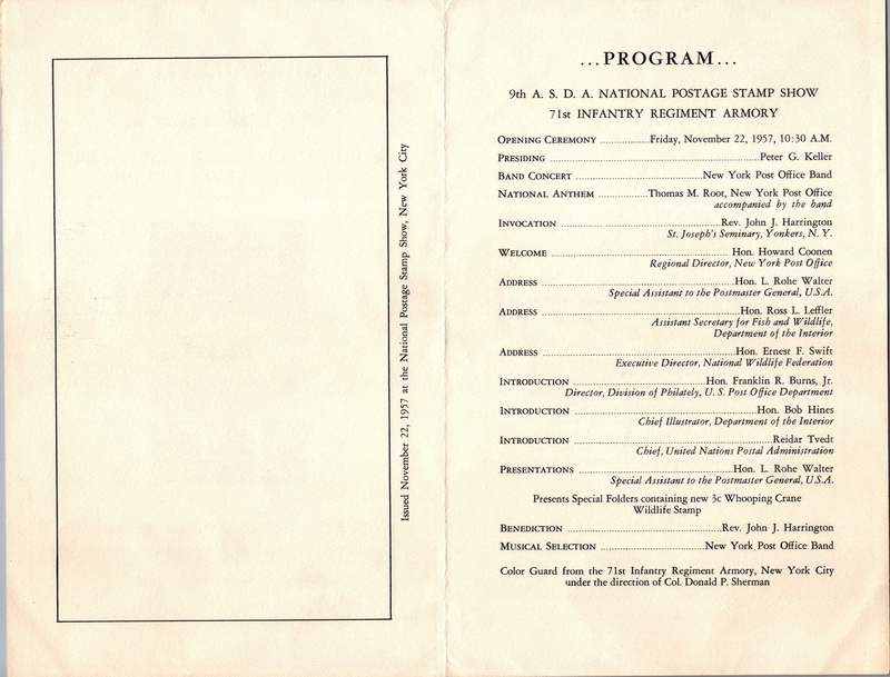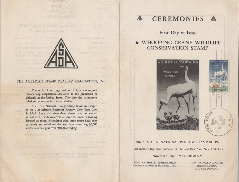 | | Oversized Items | | 1368 | 1098 | 11/22/1957 | Wildlife, Whooping Cranes; ASDA; Ceremony Program; New York NY | $50.00 |