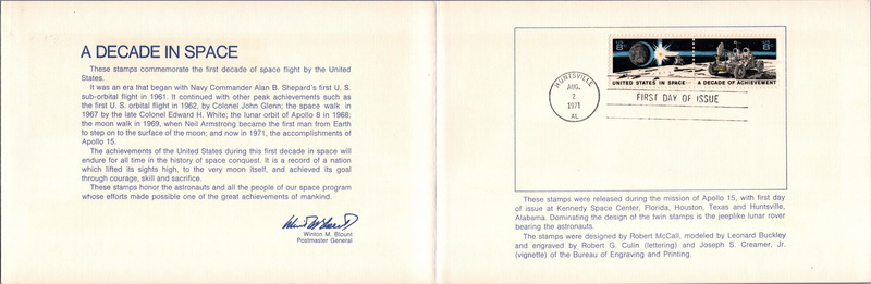 | | Oversized Items | | 1375 | 1435a | 8/2/1971 | Space Achievements, Pair; USPS; Ceremony Program; Huntsville AL | $20.00 |