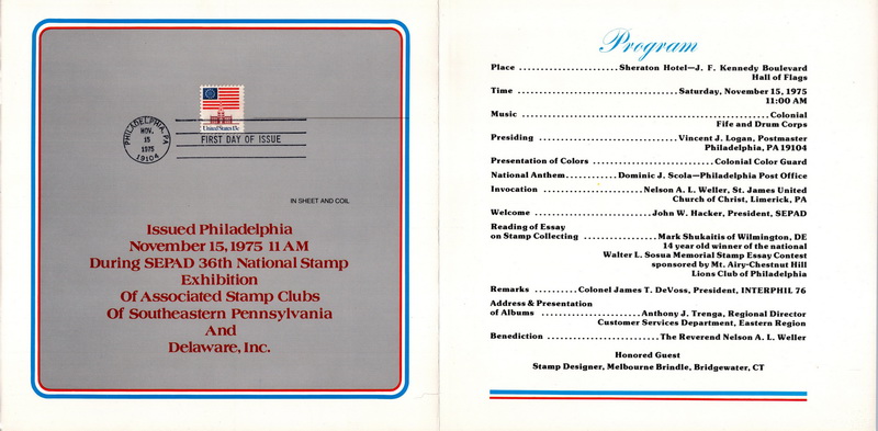 | | Oversized Items | | 1378 | 1622 | 11/15/1975 | Flag over Independence Hall; USPS; Ceremony Program | $15.00 |