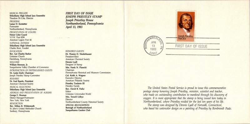 | | Oversized Items | | 1382 | 2038 | 4/13/1983 | Joseph Priestley; USPS; Ceremony Program | $15.00 |