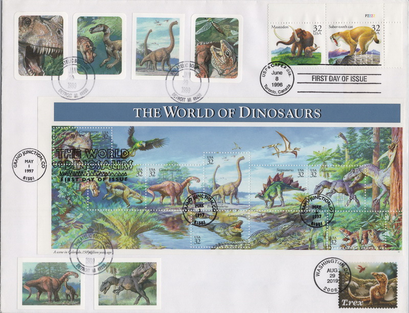 | | Oversized Items | | 1386 | 3079 | 6/8/1996 | Prehistoric Animals, Mastodon; H. N. Local Post; With #3080; Dual FDOI #3136 top-half sheet, #5410 T.rex, and Detroit MI Philatelic Boutique cancel on faux dinosaur stamps; #3079 and #3136f with "H.N" perfins | $40.00 |