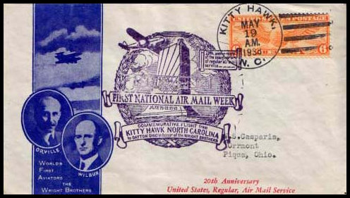 | 30 | Events | 19380519 |  | C#: MTD: PD: QTY: DSC: | 1 thm pas Original National Airmail Week; Kitty Hawk, NC; backstamp Dayton, OH 05/19/1938; with RSC; C23 cachet; Franked with C23 |