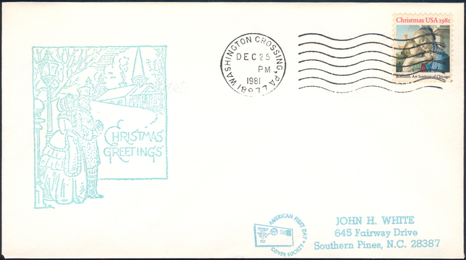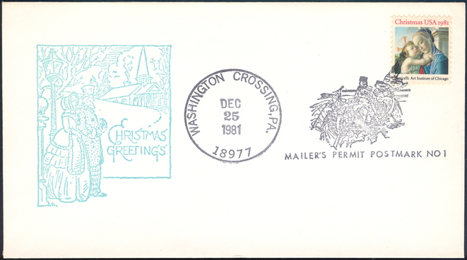 | 18 | Events | 19811225 | ,_with_1939.jpg) | C#: MTD: PD: QTY: DSC: | 1 rsc Original 5 Christmas Greetings generic cut; Franked with #1939; Washington Crossing, PA MMP #1 |