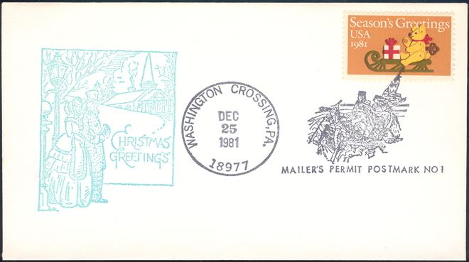 | 17 | Events | 19811225 | ,_with_1939.jpg) | C#: MTD: PD: QTY: DSC: | 1 rsc Original 5 Christmas Greetings generic cut; Franked with #1939; Washington Crossing, PA |
