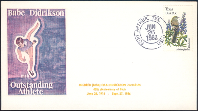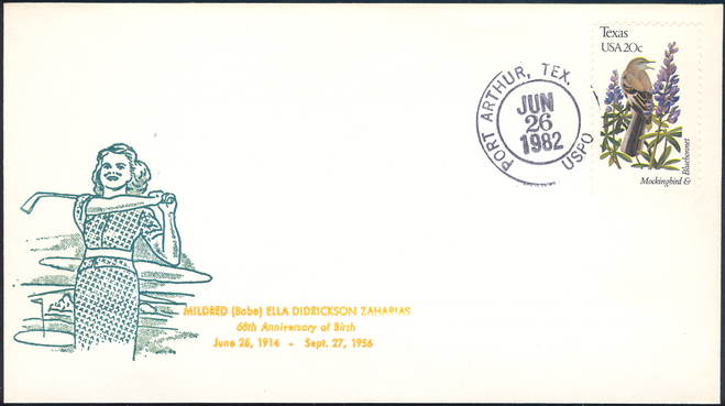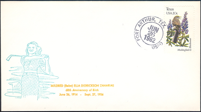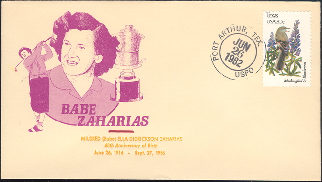 | 24 | Events | 19820626 | ,_01.jpg) | C#: MTD: PD: QTY: DSC: | 1 Original 3 Zaharias 68th Birthday; Bittings cachet with text added by JLP; Port Arthur, TX |
