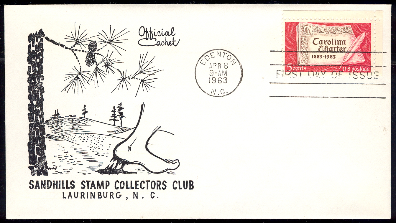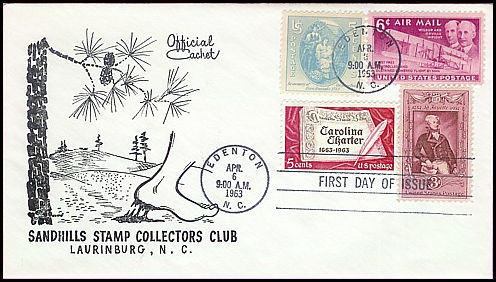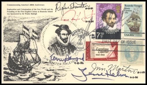 102.. | 2093 | |  | CM: C#: MTD: QTY: DSC: | Carolina Cachets 1 1 Combo #796, 1230, England Sir Walter Raleigh Stamp; Signed by John Edwards, Jesse Helms, Jim Hunt, Jim Martin, Rufus Edmisten, and Terry Sanford; In North Carolina University Library, Artifacts Collection.; First |