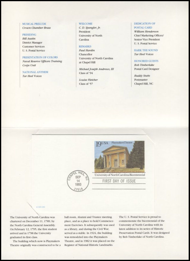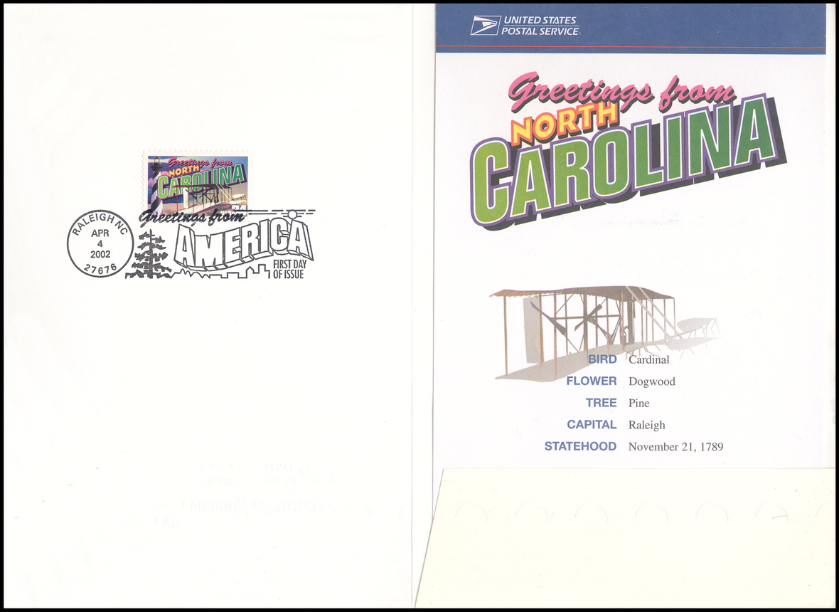 33 | 3593 | |  | CM: C#: MTD: QTY: DSC: | United States Postal Service 4 2002 Stamp Program folder for #3593; FDOI inside folder at left, and card insert on right about NC; FD Program |