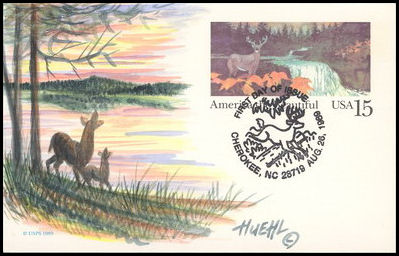 586 | UX133 | |  | CM: C#: MTD: QTY: DSC: | Huehl, Don 1 hdn hpd 3 Two Deer (Does) at lake, sunrise |