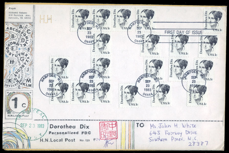 44 | 1844 | |  | CM: C#: MTD: QTY: DSC: | H. N. Local Post 1 1 HNLP #139 on 7x10 manila envelope, stamps arranged to form "J.W", made for JHW |